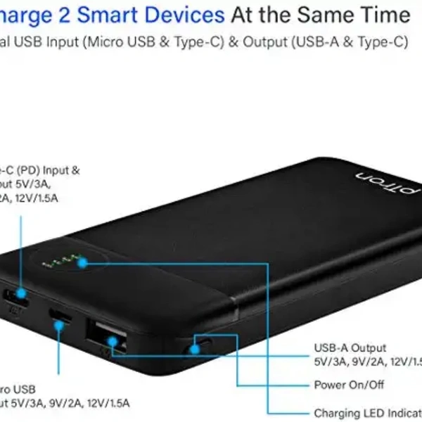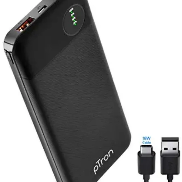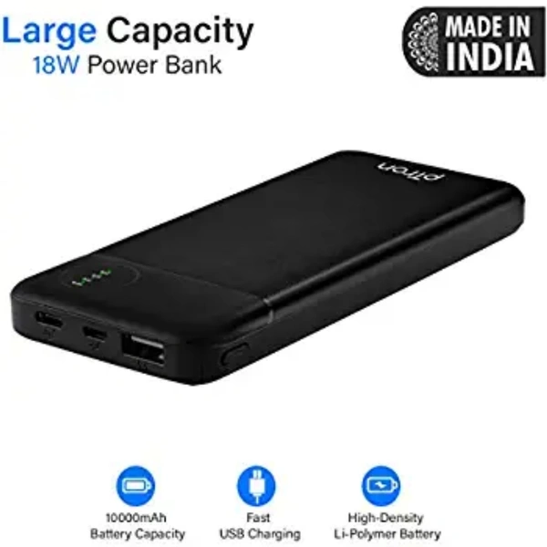 pTron Dynamo Pro 10000mAh 18W QC3.0 PD Power Bank, Made in India, Fast Charge, Type-C & Micro USB Input Ports, with 18W Type C Mini Cable for Smartphones & Other Smart Device - (Black)